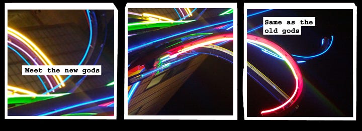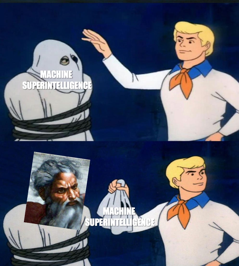 So it is a little suspicious to me that, such a short while after God was pronounced dead, this new character has pulled up wearing a cardboard box on his head, going “Beep boop, I’m the machine superintelligence, hop in and let’s all go back to my place for some eternal life and the solutions to all your problems! Oh, and don’t forget to give my prophet a bunch of money, otherwise the evil version of me is definitely going to show up and bring about the apocalypse.”