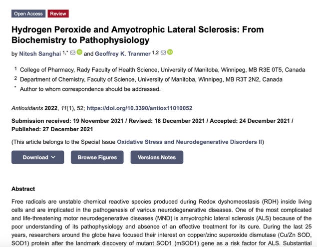 Well, I don’t know shit about ALS, but I do another quick search: “Hydrogen peroxide ALS”, and…huh, would you look at that! A whole review on the interaction between the two.