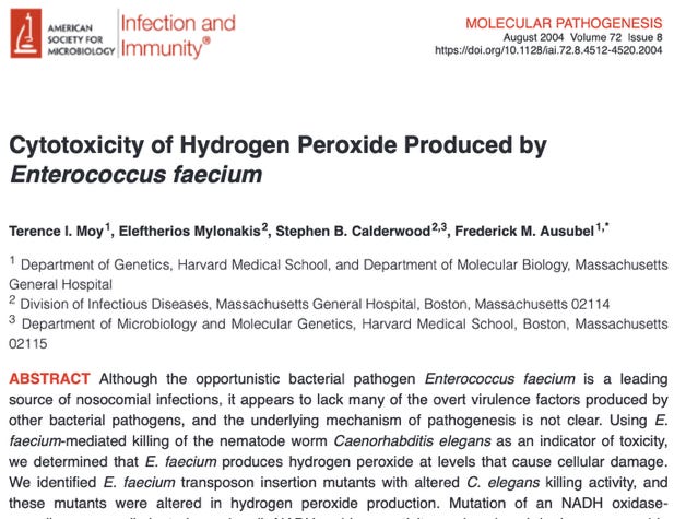 I shake my head. A few more facts rattle out. It’s in the same family as Lactobacillus and Streptococcus, meaning it’s oxygen-tolerant—part of what helps it spread in settings like hospitals. There’s a veterinary probiotic that uses some strain of Enterococcus, although whether that’s E. faecium or E. faecalis escapes me. I survey this paltry collection of puzzle pieces; certainly nothing that looks like it connects to a paralytic motor neurodegenerative disease. But I know very little, and Google Scholar knows a lot. So we search: “Enterococcus paralysis”. Sort of a long shot—but it turns up something interesting. It's a study in nematodes, describing an experiment to figure out what makes Enterococcus a sometimes-pathogen.3