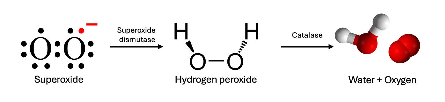 SOD’s job in your cells is to clear out a highly reactive form of oxygen that would otherwise wreak havoc; it does this by grabbing it and converting it into hydrogen peroxide. But hydrogen peroxide isn’t exactly safe either (as you might have guessed from the fact that it’ll bleach your hair), so your cells have another enzyme called catalase, which scrubs out the H2O2 as it’s produced, converting it back into H2O and regular O2
